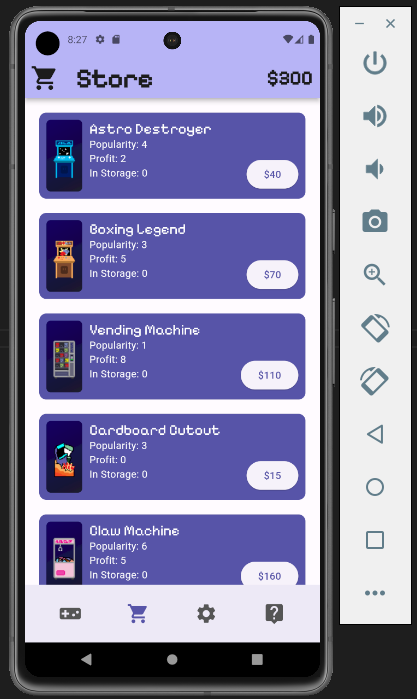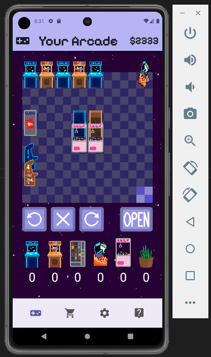 In Arcade Arena, players run and operate their own arcade. They begin with a small amount of money, which they can use to purchase machines and decorations to spruce up their business. Each in-game day ends with a financial report showcasing your earnings and visitors, allowing you to buy more items to make your arcade the snazziest place on the block.